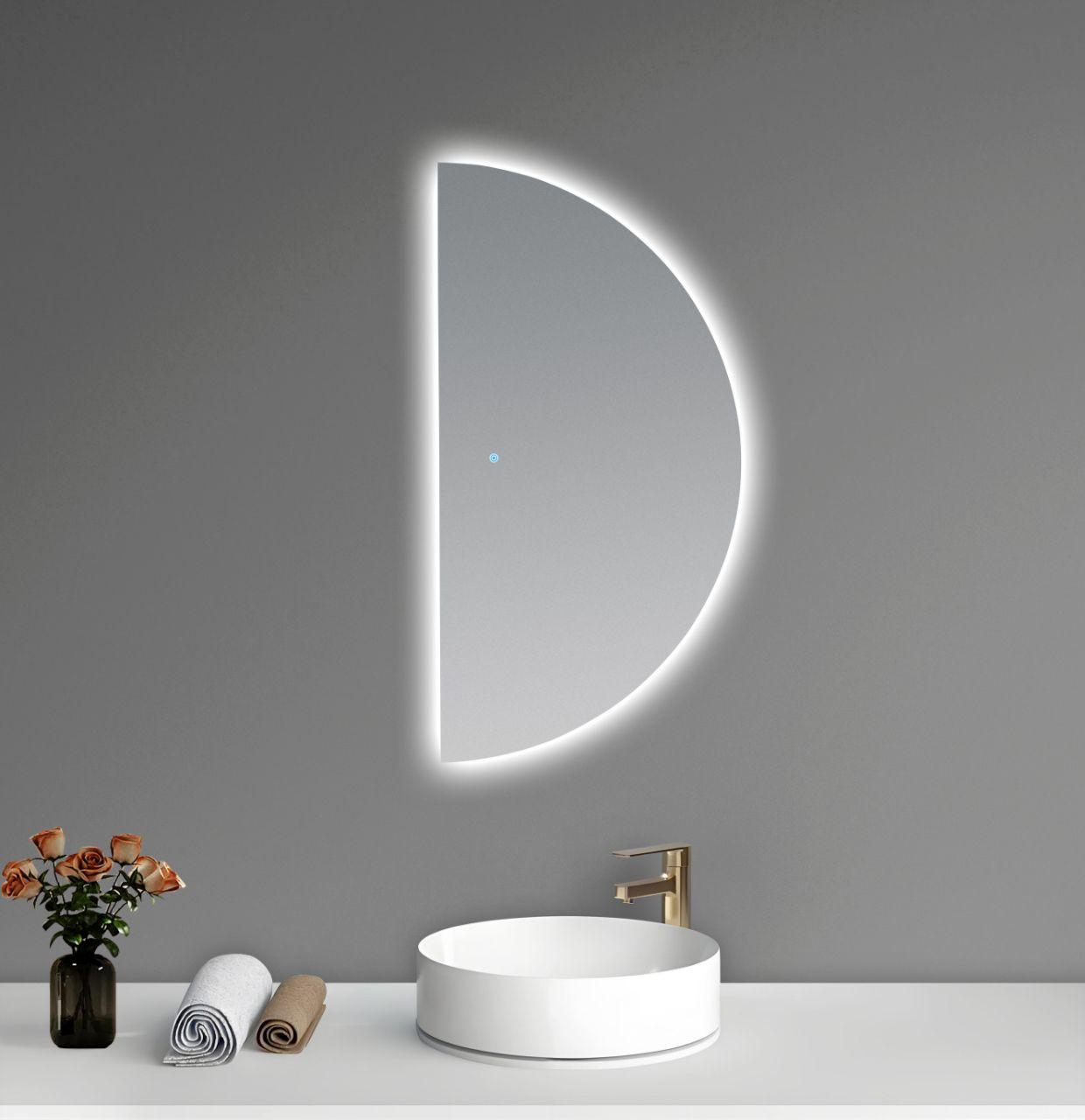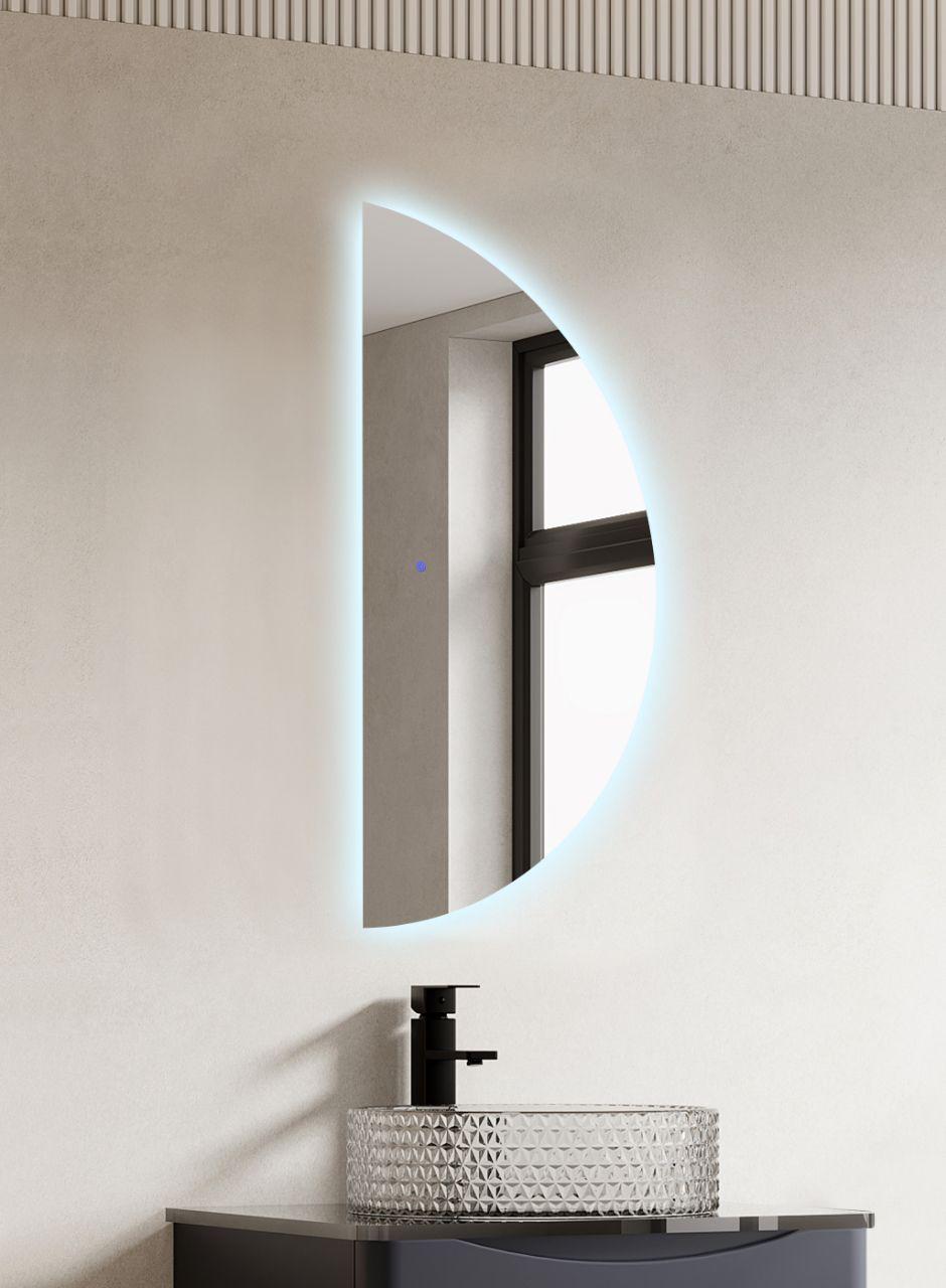 מראה מודרנית בצורת חצי עיגול עם תאורת LED רכה שמוסיפה אלגנטיות ואופי לחלל האמבטיה. הצורה הייחודית והקווים הנקיים יוצרים נוכחות עיצובית בולטת שמתאימה בדיוק לאוהבי מינימליזם וחדשנות.